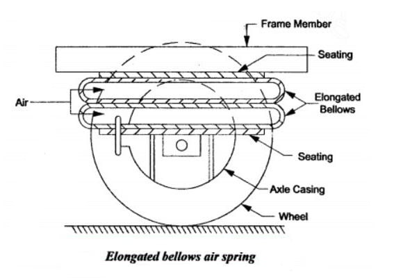 当空气悬架应用于车辆后轴时,采用了拉长风箱式空气悬架系统。这些就像波纹管式弹簧,但在形状上近似矩形,有两个半圆形的末端。这些肘形结构连接在后轴和车架之间。