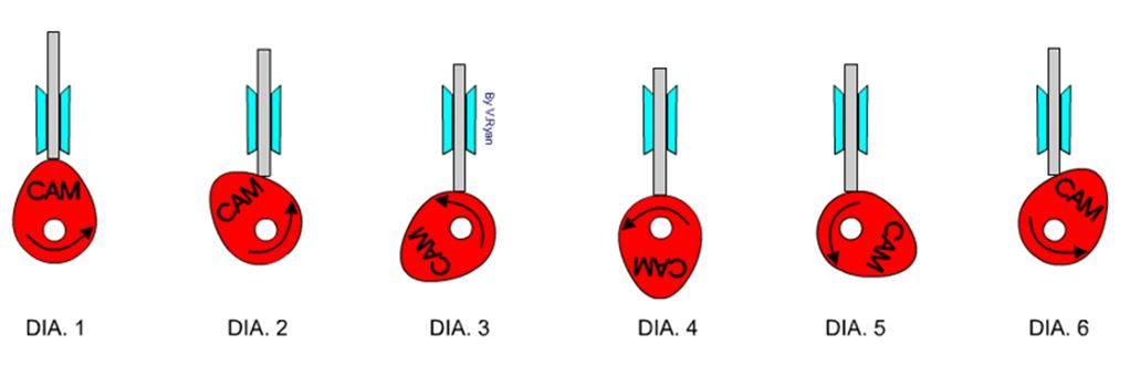 图中显示了凸轮和从动件的不同阶段。凸轮不是圆形的形状,因此当旋转时,它提升从动件向上和向下。在图一中,凸轮的峰值已将从动件提升到最充分。当凸轮旋转在一个逆时针方向从动件下降,然后再次开始上升后,凸轮已移动180度。