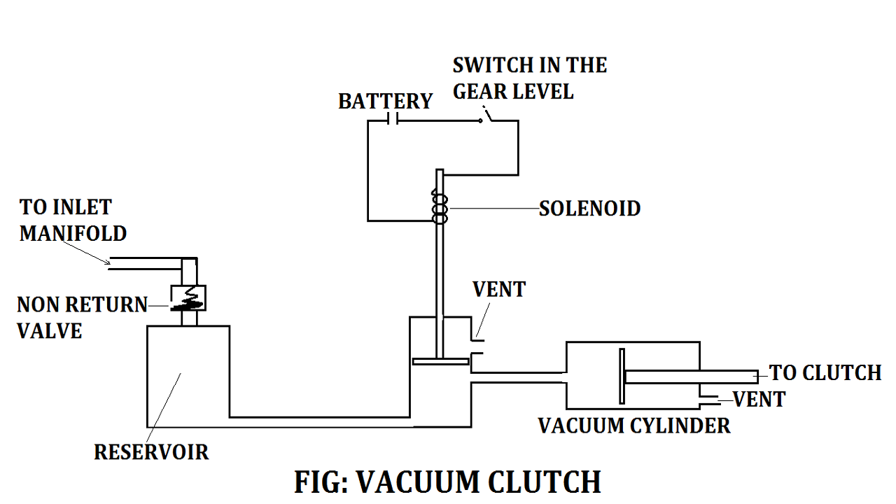 储液器连接到电磁阀,电磁阀由电池和变速杆上的开关操作,控制阀连接到真空缸上,由活塞和柱塞组成,活塞和柱塞进一步连接到释放叉和释放轴承。