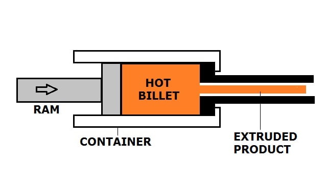 热挤压一般在卧式液压机上进行。这一过程所涉及的压力可以从30 MPa到700 MPa不等。为了保持高压,使用润滑。油或石墨在低温挤压中用作润滑剂,玻璃粉用于高温挤压。