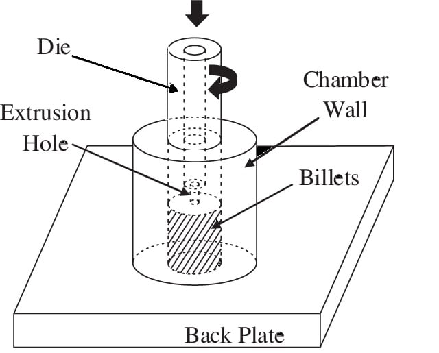 在摩擦挤压技术中,坯料和容器被迫相互反向旋转,同时在工作中,坯料被推过模腔以产生所需的材料。