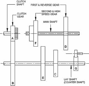 滑动狗式离合器位于离合器档位和第二档位的中间,其他的则位于第一档位和倒车档位之间。所有齿轮都独立于花键主轴。