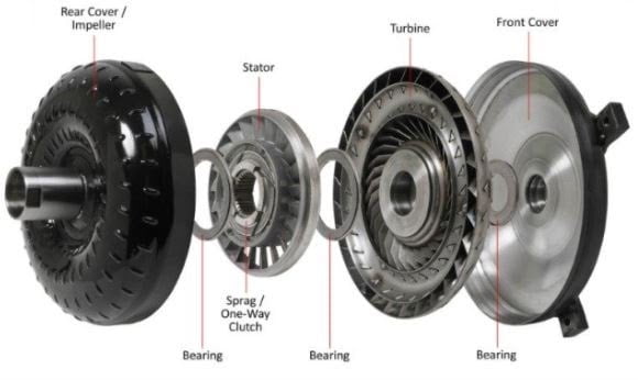 这是一个流体联轴器,允许汽车拉离和停止,而不减慢发动机,尽管有一些损失的效率,因为它采取了驱动,因为涡轮叶片的弯曲模式向内转换器。