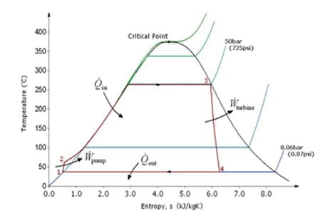 在上图中,过程2-3是朗肯循环的加热过程,这是一个恒压过程,锅炉在其中运行。朗肯循环的效率取决于点2到点3的加热平均温度,效率与加热平均温度成正比,而加热平均温度本身又与锅炉内加热时的压力成正比。
