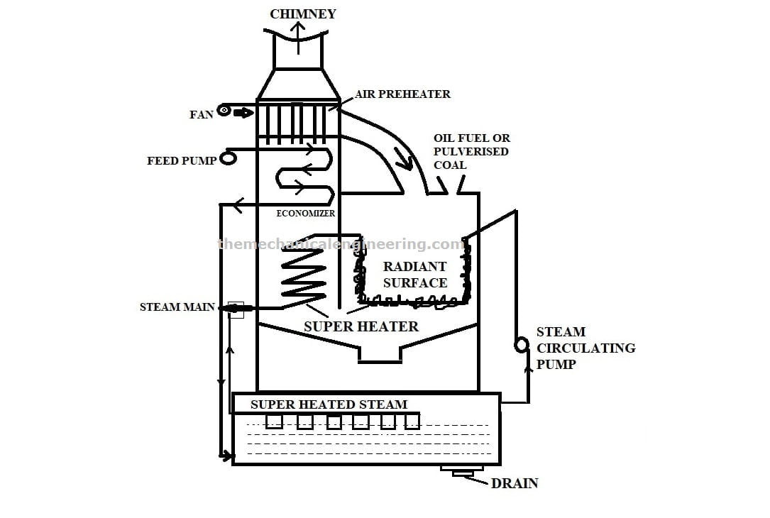 烟道气(含一氧化碳)2H2O, O2N2)从燃料(一般是煤粉或天然气)的燃烧被用于过热蒸汽和在省煤器,预热器和再热器部分。烟道气然后通过烟囱释放到大气中。