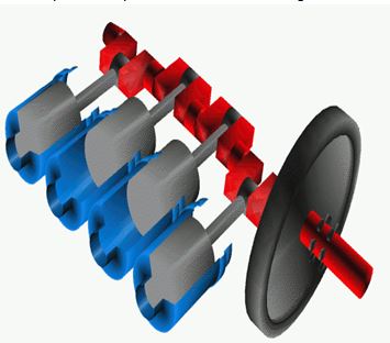 - 发动机由活塞-汽缸结构组成。活塞通过连杆连接到曲轴上。