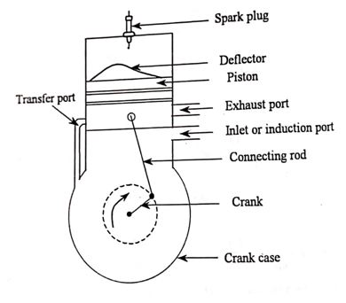 - 在二冲程发动机中,没有排气和进口阀门,而是有排气和进口端口。这些端口是由活塞本身的运动控制的。